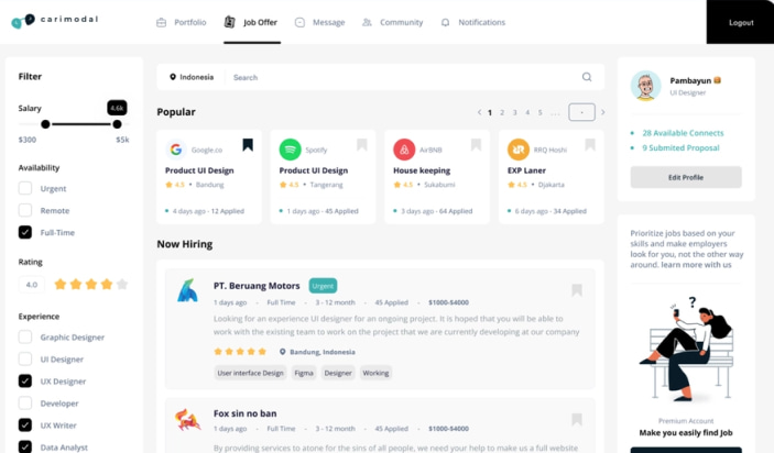 Discover a list of top talents by using the search filters with needed skill or freelancer type.